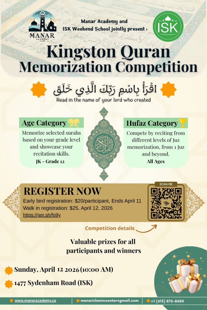 2nd Annual Kingston Quran Memorization Competition 2026 We are delighted to announce the 2nd Annual Kingston Quran Memorization Competition, a collaborative effort between Manar Academy Private Islamic School and ISK Weekend School. Following the tremendous success of our inaugural competition in 2025, we are excited to bring this inspiring event back to our community on […]